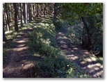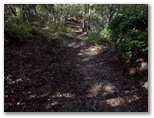 焼山山頂からは、草叢の道を北に下ります。行く手の二子山がよく見えるのはいいのですが、また相当に下らなければなりません。その標高差は約70m。もったいないのですが、仕方がありません。とにかくアップダウンの激しいのが、きょうのコースです。焼山山頂から約15分ほど下ると、林道への道を右に分けました。地形図を見ると、その沢沿いの林道はバス道路に通じているので、エスケープルートとして、あるいは逆に焼山への最短登山路として使えそうです。