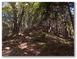 武川岳山頂で25分ほど休憩して、立ち上がりました。まだきょうの行程の半分も来ていないのです。引き続き美しい広葉樹林の尾根を緩やかに下り、軽く登り返した小峰が蔦岩山(つたいわやま:1004m)。ここで武川岳を振り返ることができます。頂には目立たない小さな私製標識があるだけなので、知らずに通り過ぎてしまうかも知れません。また南東に伊豆ヶ岳や古御岳も、近距離に望めます。そして標高差160mを一気に下って行きました。ああ、もったいない!