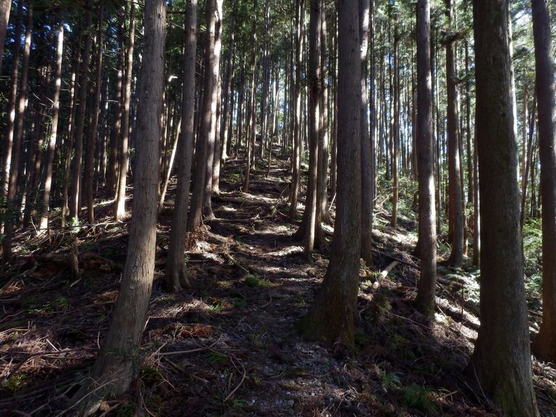 -- 杉の香る尾根道をどんどん登る。9:29