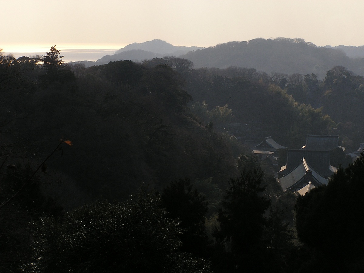 10時38分、二つ目のピークに達します。勝上巘(しょうじょうけん)という名を持つ展望台です。雲に身を隠して裾野が少しだけ見える富士山。色彩が薄いけれども、まずまず良く見える丹沢。三浦湾の向こうに箱根の山々もどうにか見えます。でも山を見るなら、空気の澄んだ早朝に登るべきでしょう。海は青い空を映して青々としています。実を言うと、午後遅くに、逆光で望む三浦湾がお奨めです。荘厳な鎌倉の海の輝きを、いつまでも見ていたく思ったことがあります。眼下には、きれいな屋根の建長寺。いくつかあるお堂の並びがややファジー(不規則)気味で、親しみを覚えます。