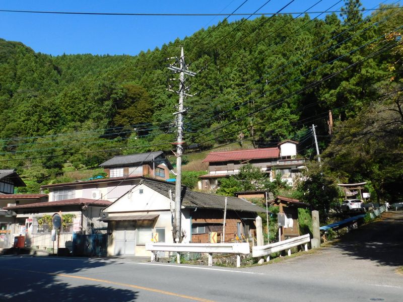 -- 猪鼻熊野神社(右奥)と荒川郵便局(左) 8:47