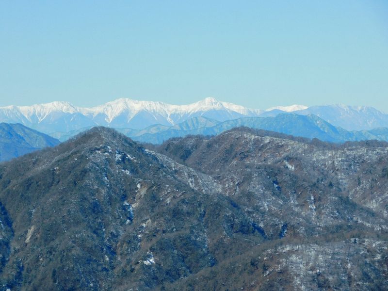 -- 同角ノ頭(左手前)の彼方に、白峰三山。