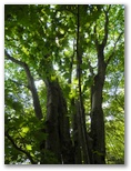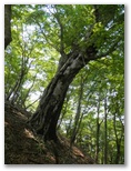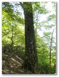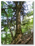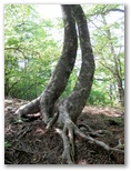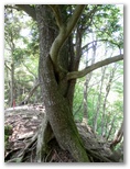 栂立ノ頭で、鹿柵は終わりです。解放された気分で、生き生きと緑いっぱいの混合林を登って行きました。木々の姿には、人間を思わせるような面白い造形があります。ブナは単独でもそれぞれに個性的。異種の木が入り組んで1本の木のように立っていることも珍しくありません。腐葉土の地面は柔らかく、足にやさしいのですが、下草がほとんど見られないのはどうしてでしょうか。日当たりはほどほどにあるので、梅雨入りすれば様変わりするかもしれません。