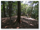 タロベエ峰で鹿柵を越え、細尾根を下ります。鞍部手前で次の鹿柵を越え、登り返しでもう一度越えると、尾根が広くなります。冬に歩いたときは、明るいすてきな雪原でしたが、すでに木々の葉が濃く繁り、イメージがすっかり変わっていました。この幅広の尾根を抜けると、ツガやモミが増えてきます。やがて尾根道が左方向へ転じ、私が「並木通り」と呼ぶ、短いけれども感じのよい尾根を散歩します。ほぼ真南に進んで、一登りすると、六百沢ノ頭に到着です。