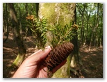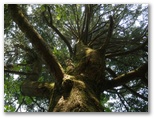 右から尾根を合わせると、すぐに1043m峰のはずです。それらしい場所で標識を探しましたが、何もありませんでした。これは鐘沢ノ頭でも同じで、地図で見当をつけ、写真を撮りました。個性的な巨樹が多い中で、特に印象的だったのは、1150m付近にあったウラジロモミです。横綱級の巨体に加え、下から見上げた姿には、仁王のような力強さと、千手観音のような威厳を感じました。地表にはマルバダケブキやアザミなども現れ、深山らしい雰囲気になっています。