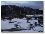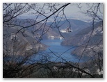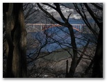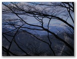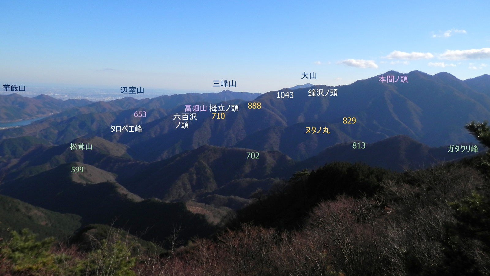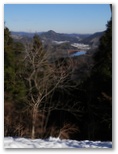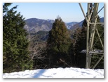 鉄塔の下から、宮ヶ瀬湖を望めました。オレンジ色の「虹の大橋」とピラミッド形の仙洞寺山。南山の右には宮ヶ瀬ダムと厚木市街地方面。うるさい枝越しに大岳山と御前山も見えました。この鉄塔の下は、栂立尾根では貴重な展望地です。尾根上の鉄塔が普通そうであるように、樹木が払われて明るいので休憩にも好適地でしょう。雪も真っ白できれいでした。