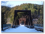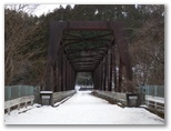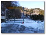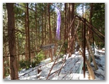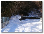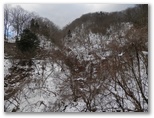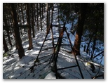 神奈川県造林公社の看板がありました。簡単な地図に、現在地が示されています。これを見ると、自分では北だと思いながら、南に向かって下りてきたのでした。何だか狐にバカされたような気分です。目の前には宮ヶ瀬金沢が右から左に流れ、対岸の土手の上に、金沢林道が見えます。沢の流れを見て、最も簡単に渡れそうな箇所を選び、右岸に移りました。土手を登る段ではアイゼンがよく利かなくて、立ち木の助けを借りながら、何とか体を引き上げました。