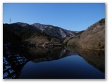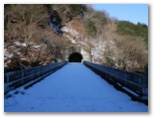 バスを終点の宮ヶ瀬で下りて、早戸川林道に進んだのは私だけでした。舗装された林道の表面で、融けた雪が凍結してツルツルしています。滑ったらスケーティングをするつもりで歩いて行きました。青い空を映す宮ヶ瀬湖は、空よりも青く、鏡面のように滑らか。春ノ木丸北尾根の突端を回り込み、汁垂橋(しるたればし)と汁垂隧道を通過し、さらにもう一つの岬を回り込みます。宮ヶ瀬湖の最奥部では、丹沢三峰から派生するいくつかの尾根を水面に映していました。
