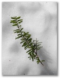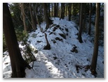そのきれいな尾根を20分ほど登ると、やや暗い針葉樹林になりました。落ちた小枝を見ると、ウラジロモミ、モミ、ツガなどが混生しているようです。拾った小枝の一部をポケットに入れ、帰宅後に調べることにします。やがて尾根が細くなり、尾根上に露岩も見られるようになりました。積雪が斜面をずり落ちるのか、ヤセ尾根の中心線上は雪が少なくなっています。市町村界標の短い赤帽黒杭が露出して、よい目印になっていました。