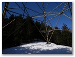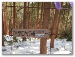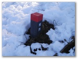 32号鉄塔から3分ほどで、タロベエ峰でした。厚手のベニヤ合板で作った、私製の名標が鹿柵に括り付けてあります。樹木に囲まれ、展望はありません。何もすることがなく、山頂の脚立を使って、鹿柵の左(南)側に戻るだけです。その先の鞍部まで下ると、鹿柵の三叉路がありました。ここにも壊れかけた脚立がありますが、鉄線でしっかり固定されているので安心して越えられます。そして次の脚立の向こうに、きれいな雪原が見えてきました。