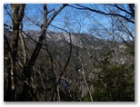 燃料補給が済んだので、先に進みます。六百沢ノ頭から少し下って、鹿柵の扉をくぐったり、脚立越えをしたりして、相変わらずボロ鹿柵沿いに登って行きました。右手に焼山や奥多摩の山々が望めましたが、樹木が多いので、冬季限定の眺望です。幾つ目かの鹿扉をくぐった先に、鹿柵が倒れて雪に埋もれている箇所がありました。これより右手は明るい魅惑的な尾根、左は薄暗い急峻の尾根です。一瞬右に行きかけましたが、思い直して左へ進みました。これ、正解かな?