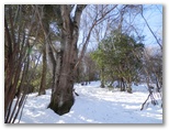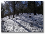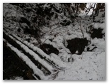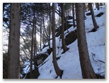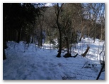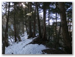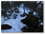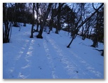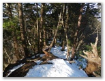 積雪はよく締まっていました。軽アイゼンの爪がよく利きます。雪の上には針葉樹の小枝や枯葉が落ち、見た目はあまりきれいとは言えません。樹木の枝先から落ちる滴が穿った、同心円状のくぼみが無数に見られました。人の足跡は見られませんでしたが、むしろ動物の足跡に気を使います。ほとんどは鹿の足跡ばかりですが、熊の足跡を見逃してはなりません。