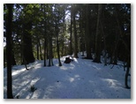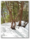 栂立ノ頭も樹木に囲まれ、展望はありません。でも、ふっくらした、きれいな雪が積もっていました。その名のとおり、本当にツガの木が何本か立っています。雰囲気のよい峰で、立ったまま幸せの紅茶(?)を飲みました。南西の空に、本間ノ頭と鐘沢ノ頭とが高く望めます。できれば鐘沢ノ頭まで往復したいと思って来たのですが、そうすれば明るいうちに下山できなくなるでしょう。この雪では、無雪期の1.5倍ほど疲れます。欲張らずにきょうはここまでとしました。