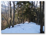 登山口に誰かが置いていった頑丈そうな天然のストック(木の枝)を拾い上げました。登り始め、いきなりヤブが待ち受けます。カヤトの先で目を突かないように気を付けながらヤブをかき分け、積雪で踏み跡の分からなくなった斜面を適当に登ること7~8分、栂立尾根上の小さな鞍部に乗りました。西面がわずかに開け、送電線と東海自然歩道の一部が望めます。これより本間ノ頭まで続く栂立尾根は、多少の屈曲はありますが、基本的に南西方向に上って行きます。