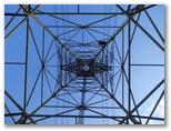 鉄塔には、「新多摩線32」の銘板がありました。見上げると、なかなか勇壮です。作業員用のゴンドラと垂直モノレールがありますが、高いところで一つ間違えると絶叫マシーンではありませんか。これはさておき、山で送電鉄塔を見上げるたび、人間は大自然の中で小さな存在でありながら、凄いものを造るものだと思います。奇跡には、神の奇跡、人間の奇跡、自然の奇跡、悪魔の奇跡がある!と私は言います。これは人間のプチ奇跡だ!