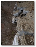基本どおり鹿柵の左側を登って行くと、ちょっと大きな露岩がありました。ここでは露岩と鹿柵の間の狭い隙間を通り抜けましたが、左側を巻くこともできます。左手のやや離れた斜面に、露岩の頭がたくさん見えましたが、巨大な岩が雪に埋もれていたのかも知れません。この辺りが、この日一番の急傾斜でした。そしてこの急傾斜を登り切ったところに脚立が現れ、慎重に乗り越えて栂立ノ頭に到着しました。