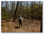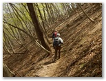 風は台風のように、時折り暴風となって吹き荒びました。帽子を手で押さえ、足を踏ん張って歩きます。体も冷えびえ、木枯らしのような寒さを感じるほど。明るい尾根なので、風さえなければ、遠足気分で楽しく歩けたでしょう。それでもアカヤシオが咲いていれば.....いいのですが、見られるのは地面に落ちた花ばかり。でも、標高の高いところに行けば.....少しは咲き残っているかも知れない、と期待しながら、山頂に向かって登って行きました。