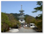 さわらびの湯が臨時休業中なので、金比羅神社跡から鳥居に下りました。急下降で一気に高度を下げて行きます。すると左の尾根に立つ純白の観音菩薩像が見えて来ました。救世大観音と呼ばれる巨仏です。そして急下りが終ると、三層の塔の正面に下り立ちました。説明板によると、この仏塔は「玄奘三蔵塔」と言い、玄奘三蔵法師の霊骨が祀られています。その石棺は昭和17年、当時の日本軍が中国で発掘したとの由。ここは眺望も好いので、もう一休みして行きましょう。