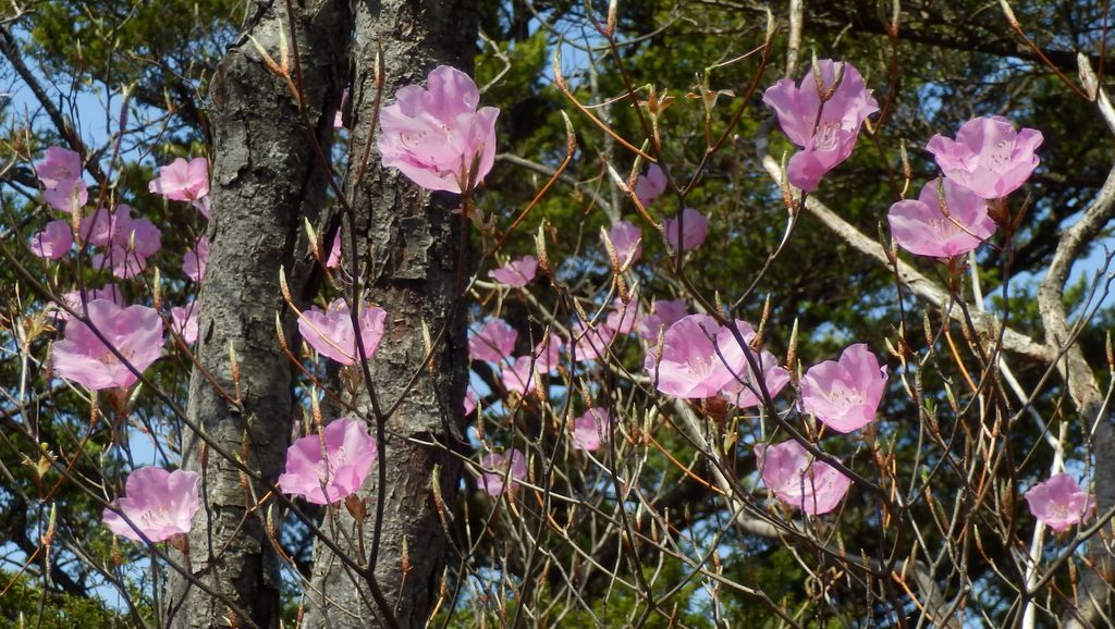 -- 強風に煽られるアカヤシオ、今にも風に乗って飛んで行きそう。10:26