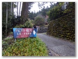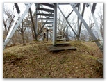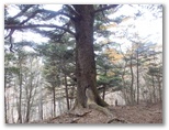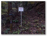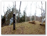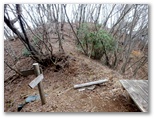 これより東海自然歩道の鳥屋分岐に至る道は、ハイウェイのように歩きやすい道でした。廃道になったとはいえ、近年まで登山道であっただけのことはあります。そして、「登山者の皆様へ」という白い立札を、初めて裏側から見て、東海自然歩道に立ちました。そのまま焼山に直行します。山頂に到着すると、展望台にロープがぐるりと張られていました。何か問題が生じたのでしょうか? きょうの天候では展望が利かないので、上るつもりはありませんでしたが。