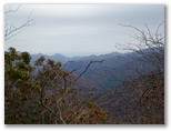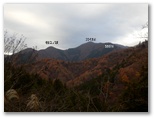 とても遠回りになりましたが、この計画は結果的に大正解。音見沢橋の先の林道支線は、眺望絶佳のスーパー林道でした。伊勢沢南岸の尾根、栂立尾根、ガタクリ三峰(仮称)、伊勢沢左岸尾根、等々のパノラマが大展開。空の晴れていないことが惜しまれます。日が差せば、紅葉・黄葉の山々が錦秋の光彩を放ったことでしょう。そして尾根の切通しから599m峰に向かいました。片道10分の平坦な尾根歩きです。599m峰で紅茶を飲み、きょうの第一目標を達成しました。