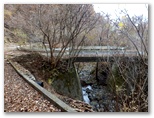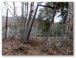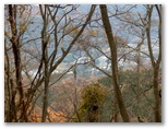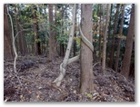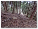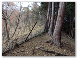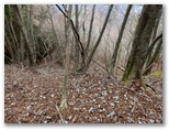 切通しに戻り、引き続き林道を進みます。尾根への取り付き点を探した結果、林道の終点で、左の尾根に容易に乗ることができました。これより、道志導水路の真上を歩きます。導水路は地下にあるので、見えません。地理院地図では青い破線で示されています。ここは南面(左)の開けた、明るい素敵な尾根。枝越しに、丹沢三峰やガタクリ峰などを望めます。すぐに左から鹿柵(植生保護柵)が現れました。そのまま柵の右側を進んで行きます。