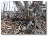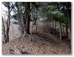 長めの休憩を終えて、先に進みます。すると鹿柵の右側が狭まり、歩きにくくなったので左側に移ると、尾根を巻くような踏み跡がありました。これを辿るとまた鹿柵にぶつかり、右上の壊れた鹿扉を通過します。その先で、根こそぎ倒れた大木が尾根に横たわっていました。狭い尾根に立ちはだかる太い松の木が、大きな枯れ木を支えています。やがて右手の樹間に、切り立った灰色の岩壁が見えるようになりました。これが幕岩、いよいよこのルートの核心部です。