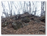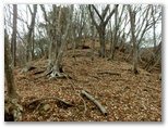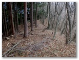 尾根に取り付いてから15分ほどで、721m峰に到着しました。南面にミニ草原のような尾根を持つ、明るい展望地です。休憩の絶好地なので、一休みして行きましょう。ダニがいなければ、昼寝も悪くありません。私はおやつとお茶を口に入れ、ラジオ体操第一をしました。実は汗をかいたせいで、少し寒気がしたのです。発熱・速乾性の下着と間違えて、形がよく似た綿100%の下着を着てきたことに気づきました。大失敗です。きょうは気温もぐんと下がりました。