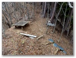 急登を終えた地点には、錆びたワイヤー、滑車、ロープなどが残置されていました。標語にもあるように「ゴミは持ち帰り」と言いたくなります。そのすぐ先の小峰を越えると、きょう初めての道標が見えました。かなり朽ちてはいますが、平戸(5.8km)と焼山(0.8km)とをしっかり指しています。傍らに倒伏した標識もあり、起こしてみると「草木を傷つけない」と書かれていました。横のベンチで小休止します。熱々の紅茶を飲んで、きょうの第二目標を達成しました。