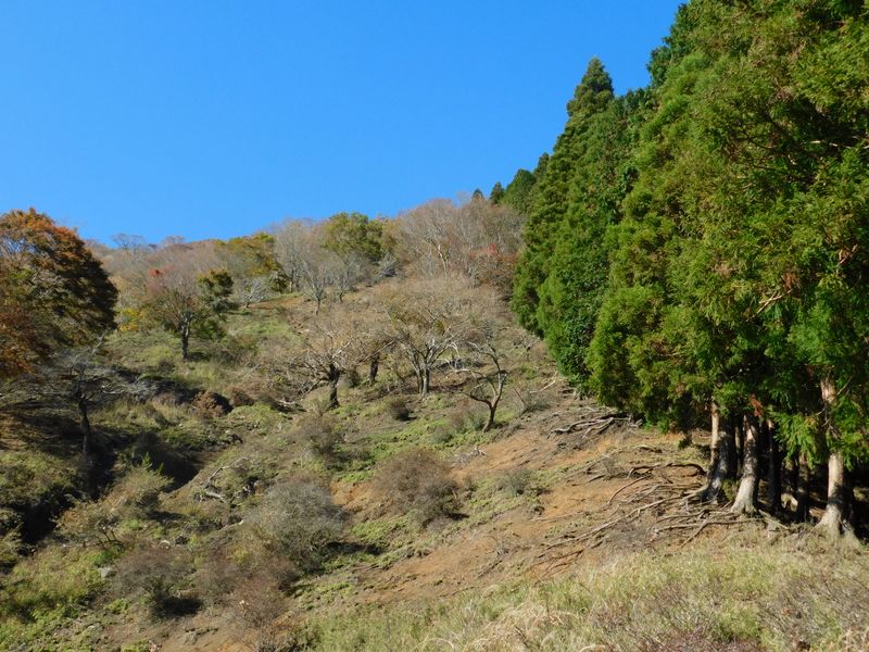 -- 笹原が終わって、尾根とザレの境界に進む。11:39