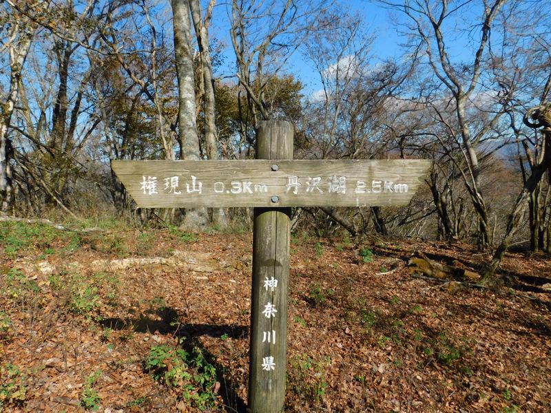 -- 道標の表側に回り込むと、権現山頂まで300m。12:18