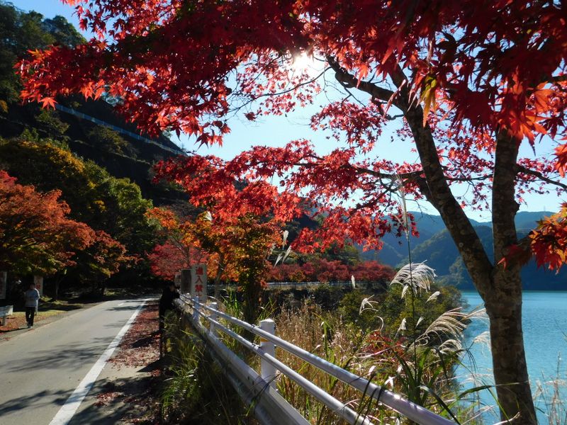 -- 展望台入口駐車場から続くモミジ並木。8:54
