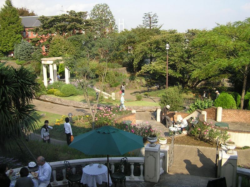 -- 山手111番館の窓より、バラとカスケードの庭。