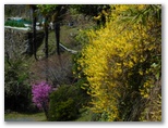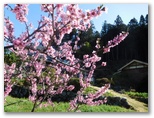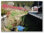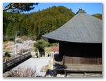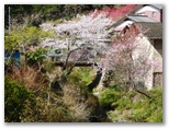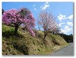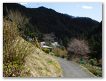さて、その虎秀川に沿う道は、今まさに花盛りでした。赤、ピンク、白、うららかな春の色が延々と続く花街道。赤やピンクは花桃でしょう。薄いピンクや白はたぶん桜。弾む足で駅から10分ほど、福徳寺の阿弥陀堂にやって来ました。ここからユガテへは、二通りの道があります。一つは「飛脚道」と呼ばれる山道。もう一つが新田まで車道を歩き、最後に少しだけ山道を登る、アップダウンの少ない道です。山歩き優先なら前者、楽チンするなら後者です。