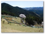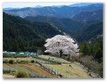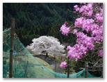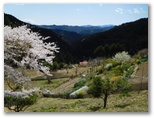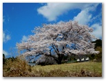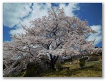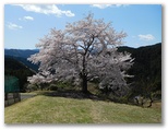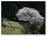 下り坂を10分ほど行くと、一本桜が見えてきました。期待どおり、満開です。枝ぶりの整った、ひと際大きな桜の木。見通しのよい山上農地に独りで力強く立ち、すべての枝の先端までふさふさと花を咲かせています。草に座って花を見る人、大きなカメラを構える人。上の道から眺めると、広大な山と谷のパノラマの中に、あたかも芸術家が置いたかのような一本桜。今、光をいっぱいに浴びて、その最大の美を発揮する瞬間に居合わせているような、感動を覚えました。