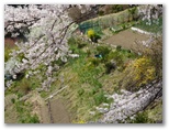 間近に一本桜と対面します。正面から、横から、下の斜面から、広げた枝の下から、そしてどこから見ても美しい桜! ソメイヨシノでしょうから、あまり長寿は望めないかもしれません。でも、南側に伸ばした太い根から、2本の蘖(ひこばえ)が立ち上がっていました。これらを伐ったり折ったりしないで、大切に育ててほしく思います。この一本桜をとっくりと鑑賞し、撮影した後、もう一度上の道に立ち、八徳の宝とも言える一幅の絵を楽しみました。