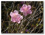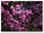 空に雲が増えてきました。顔振峠を後に、八徳に向かいます。富士見茶屋は休みでしたが、満開の桜に休みは無し。庭の枝垂桜が見頃になるのは、もう少し先のようです。赤花のミツマタはまだきれい。ヤマツツジが、ここかしこで咲き始めていました。ベラ・ヴィスタの少し先から傘杉峠まで山道がありますが、八徳に行く人は、林道を歩き続けましょう。すぐに「八徳入線林道」が左下に分岐します。この道こそ、八徳の一本桜が見られる坂道。足が勝手に走り出しました。