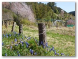 新田の道標を見て右折。5分ほどで右に山道が分岐し、道標が「ユガテ・鎌北湖」を指しています。ようやく山登りになりました。山道を10分ほど登ってユガテに到着。背の高い桜に迎えられます。のどかそうな畑地に行くと、ピンクの枝垂桜が目に飛び込んできました。背後の山を白い花で飾っているのは、ソメイヨシノでしょう。早くも紅い葉桜になったのは、ヤマザクラ? 日差しを浴びて、気ままに咲いているのは、ムスカリ、水仙、スノーフレーク、ハナニラ ...