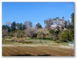濃いピンクの枝垂桜をくぐって、休憩所のベンチに腰を下ろしました。目の前は「ユガテの森のひまわり畑」です。ヒマワリが一面に咲くユガテを想像してみました。「ここは標高290m。ひまわり畑の夏は暑いだろうが、心地よい暑さじゃないかな?」なんて。ところで、人の姿が全く見えません。私だけのユガテ? 桜とツツジと菜の花と、青い空と白い雲。春爛漫のユガテ。明るい陽ざしに満ち、風はなし。ユガテにも様々な日があるでしょうが、ともかく来れて良かった!