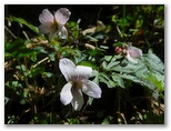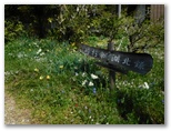 ユガテで30分以上過ごしました。次は顔振峠。「エビガ坂・鎌北湖」方面に進みます。おとぎ話のような愛らしい小花の咲く草地に、背の低い小人目線の道標を見て、進路を再確認。民家の軒先をすり抜けるように坂の小路を上ると、林道に飛び出しました。ハイキングコースの道標が山道を指していますが、無視します。林道を右に進むと、天高くヤマザクラが咲いていました。樹木の花にせよ、草花にせよ、花を見るなら明るい陽の当たる道を歩きたいものです。