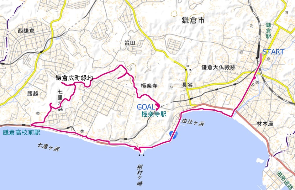 鎌倉市 ルート図 ◎ 鎌倉駅 10:13 --- 10:33「さくら貝の歌」の歌碑 10:34 ---<材木座海岸・由比ヶ浜>--- 11:33 稲村ヶ崎公園 11:55 --- 12:36 江ノ電 鎌倉高校前駅 12:36 --- 12:46 広町緑地 七里ガ浜入口 12:46 --- 13:29 広町緑地 鎌倉山入口 13:29 --- 14:12 極楽寺 14:19 --- 14:22 江ノ電 極楽寺駅 14:26 +++ 14:35 鎌倉駅 全 4時間9分 ❀❀❀ ❢