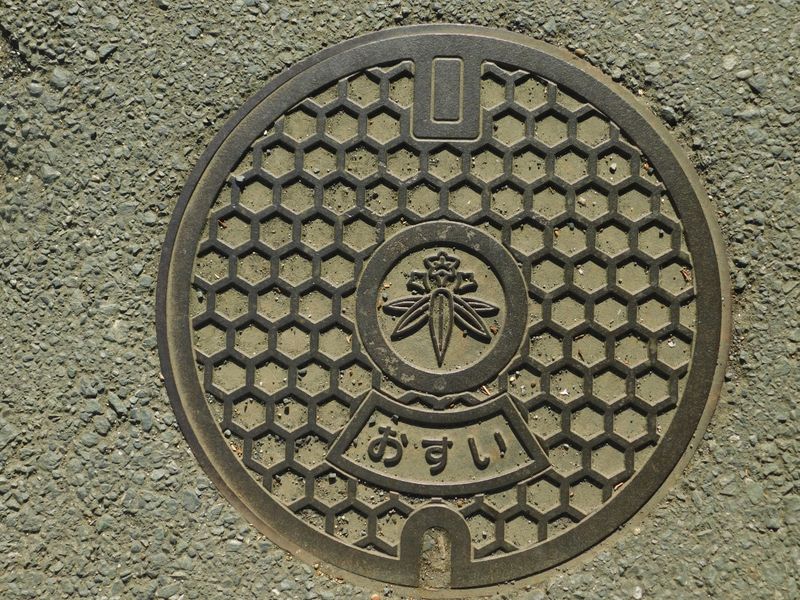 -- 汚水マンホール:中心に鎌倉市章のササリンドウ。