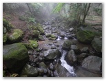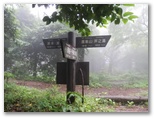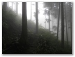 千条の滝のすぐ近くの橋で、左に蛇骨川を渡ると山道になりました。すぐ道が二手に分かれます。道標によれば、右は鷹巣山40分、左は浅間山30分。私は、まず鷹巣山を目指します。すでに午前11時を回っていましたが、樹林帯の山道は暗く、弱い雨も降り始めました。木の枝から大きな雫が首筋に落ちるたび、冷やっとします。山は濃霧がかかって、視界は50メートル程度でした。