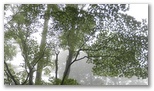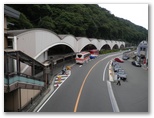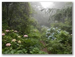 小涌谷駅で登山電車を降り、道標に従ってしばらく車道を登って、千条の滝(ちすじのたき)に行きました。高さ3mほどの岩壁から細い水が無数に沁み出すようにして、簾状に流れ落ちて行く滝です。約15年前に初めて来た時は、失礼ながら、朽ちた葉のたまった切通しを見るのと大差なく、「箱根のがっかり名所?」かと思いました。でも今回は季節柄か水量があり、濃い霧も利いています。少し離れて見れば、まずまずの風景になっていました。