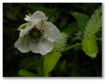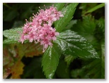 このモミジのすぐ先で、登山道と林道が斜めに交差していました。道標に、左は浅間山10分、右は鷹巣山15分とあります。ここからは起伏の緩やかな尾根歩き。空も大きくなり、楽しく歩けます。果は不味いけど、花のきれいなバライチゴが、雨粒を避けるように俯いて咲いていました。実を言うと晴れの日も俯いています。シモツケはピンクの小花に水晶玉をふんだんにあしらった、あでやか姿。人目につかない雨の日だけのおしゃれです。