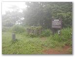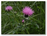 いつの間にか、雨は止んでいました。そして鷹巣山に到着。「鷹巣城跡」の説明板があります。テーブルとベンチ一式がありますが、ご婦人のグループが食事中でした。一般に城跡は見通しの利く場所であることが多いものです。でもこの日のこの山頂は、樹木と濃霧とで展望は全くありませんでした。濡れた地面に腰を下ろして休む気分でもなかったので、1~2分休憩しただけで、浅間山に向かうことに。雨粒を頂いたノアザミの花だけ撮影し、来た道を引き返します。