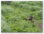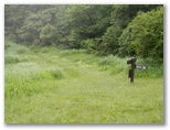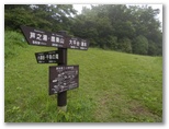 浅間山の山頂広場は、緑の草原になっています。明るくて気持ちのいい場所なので、ここで昼食にしました。東西二つの丘のそれぞれにベンチ・テーブルがありますが、すでに満席だったので、青草の上にビニール風呂敷を広げ、腰を下ろしました。時おり、ホトトギスの鳴声が遠くから響き渡ってきます。少し肌寒かったので、それまでたくし上げていた長袖を伸ばしました。暑い日差を予想して凍らせてきた緑茶を飲みましたが、本当は暖かい紅茶が欲しいところでした。