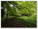 樹林帯には、モミジの木がたくさんありました。その葉は、やや黒ずんでいましたが、秋の紅葉は美しいかも知れません。空気は、ずっと堆肥場の藁のような臭いがしていました。湿った種々の落ち葉が腐葉土になって、山を豊かにしてゆくのでしょう。湯坂路の終り近く、湯坂城跡の手前(上側)に、荒れた石畳があります。ここで二人連れの若い男女を追い抜きました。「歩きにくい道ですね。」「滑るので。」石畳が濡れて歩きにくく、女性の方が難儀していたのです。