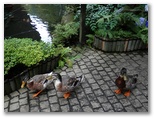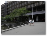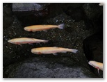 国道1号に下り立つと、アーチ形の旭橋まで行き、一旦ゴールインとしました。ここから須雲川沿いに滝通りを歩いて、玉簾の瀧(たますだれのたき)を訪ねます。所要時間は、湯本橋から片道約10分ほど。玉簾橋を渡り、大きな温泉ホテルの軒下を通り抜けるところでは少しためらいました。ホテルの裏手に二つの滝があり、「飛烟の瀧」と「玉簾の瀧」と呼ばれています。私は滝よりも、そこで泳いでいた黄色のニジマスの方に興味を引かれました。「黄色いおさかなさん、こんにちは」と言った赤ずきんちゃん、本当に黄色い川魚がいるんですね。