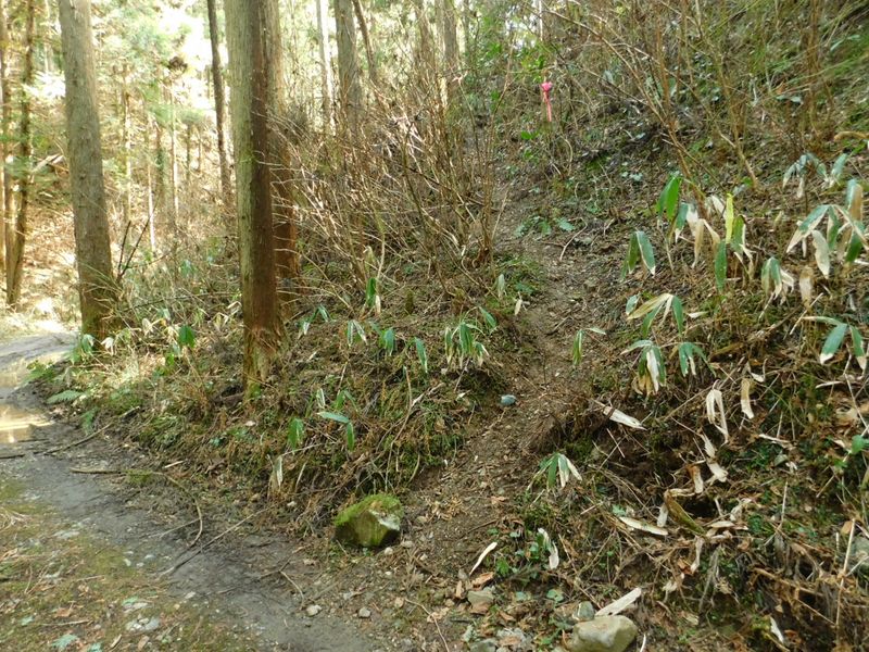 -- 境沢林道に下り立つ。右上にピンクテープ。13:44